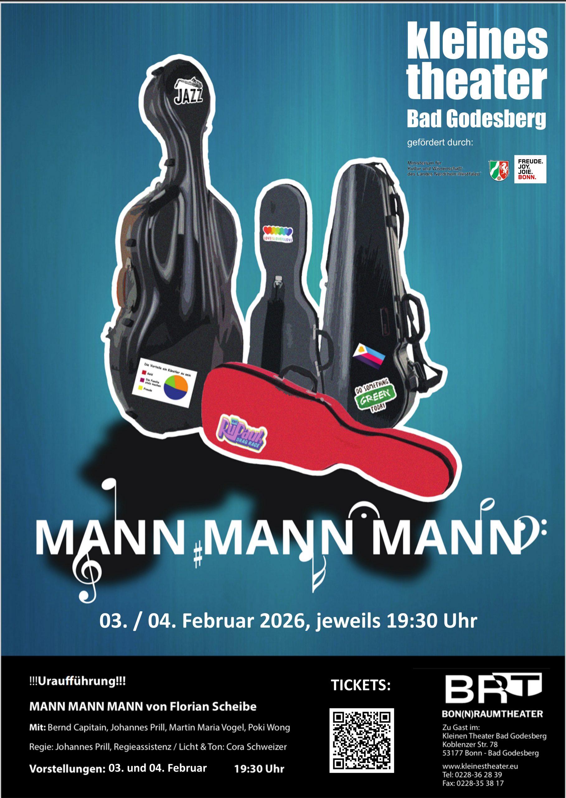Nach unseren zwei Uraufführungen von Florian Scheibes Stücken SEX AND BREAKFAST im Jahr 2022 und FLEISCH im Jahr 2023 freuen wir uns auf die Kollegen vom BONNRAUMTHEATER, die für die dritte Uraufführung eines Scheibe-Stücks gesorgt haben: MANN MANN MANN Vier Männer, vier Streichinstrumente, eine Pistole. Eine gemeinsame Waldorf-Vaterschaft und ihre Begeisterung für klassische Musik haben …