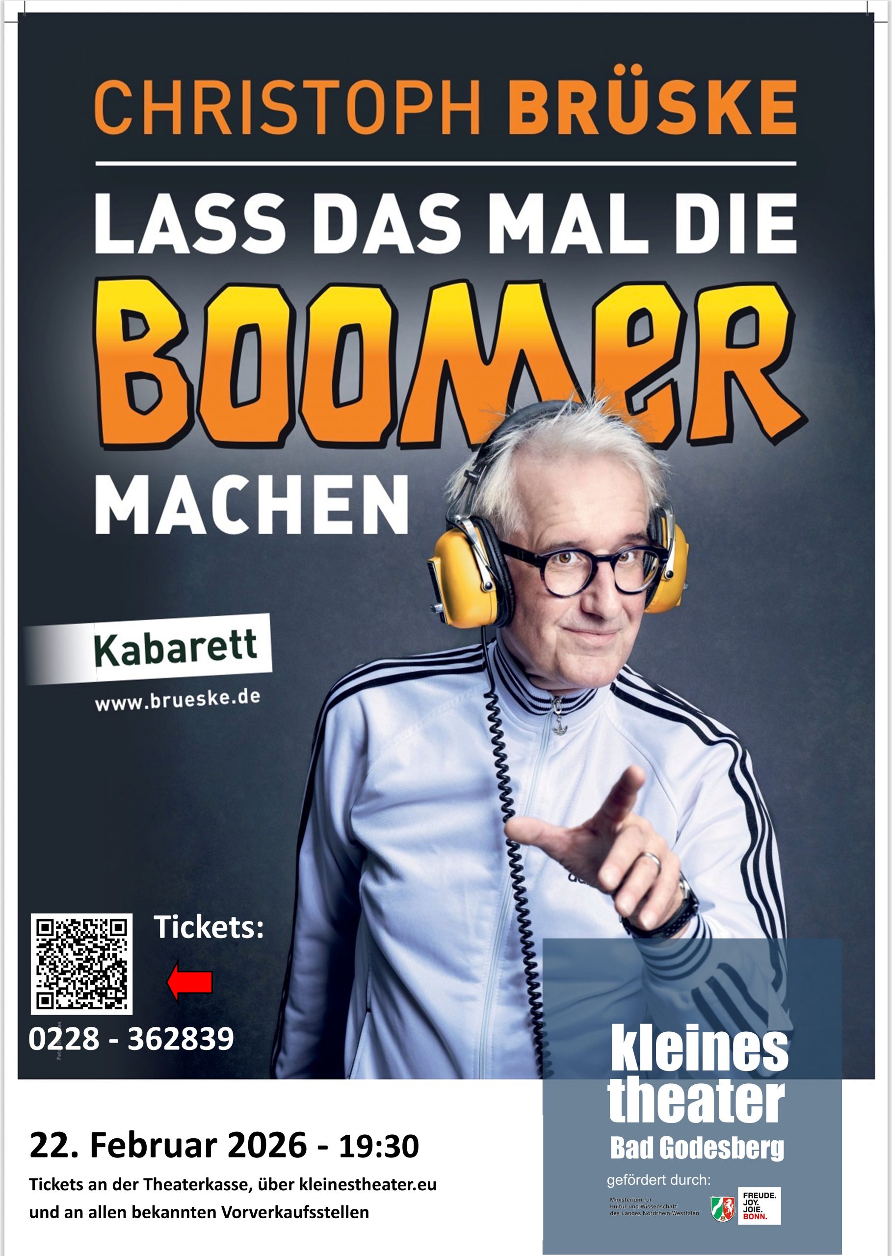 „Lass das mal die Boomer machen“ Ein hoch vergnügliches Generationen-Portrait mit Christoph Brüske 60 Jahre hat er jetzt auf dem Buckel, unser Christoph Brüske. Aber scheinbar wird er nicht älter. Denn der sympathische Kabarettist aus dem Rheinland ist ein Boomer: jung geblieben, aktiv und auf Höhe der Zeit. Wie es dazu gekommen ist? Davon berichtet …